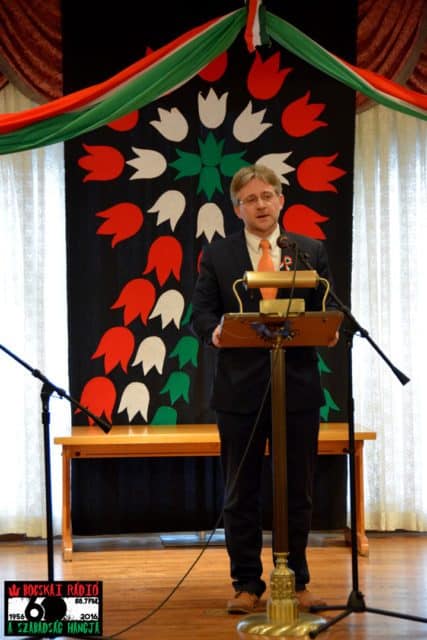Ezután következett Ft. dr. Krasznai Csaba, a Waltos Hills-i Első Magyar Református templom lelkésze, akinek köszöntő szavai és nyitó imája után dr. Márkusfalvi-Tóth Ádám a Chicago-i Magyar Főkonzulátus vezető konzulja szólt az egybegyűltekhez. Böjtös László cleveland-i tiszteletbeli konzul úr élő szóban tolmácsolta Magyarország miniszterelnökének, Orbán Viktornak üdvözlő mondatait. Majd a Nyugat-oldali Magyar Evangélikus Egyház Kis Magyar Kórus énekkarának az előadása következett, akik néhány nagyon szép alkalomhoz illő dalt adtak elő. Ezek után az Első Magyar Református Egyház Vasárnapi Iskolásai és a Nebuló Magyar Iskola tanulói adták elő színvonalas kis színpadi előadásukat. A 14. sz. Görgey Arthur cscs. cserkészei Tábor Mátyás vezetésével egy hosszabb jelenetet vetítettek elénk az 1848-as szabadságharcunk idejéből, pontosabban az akkori katonaéletről.
