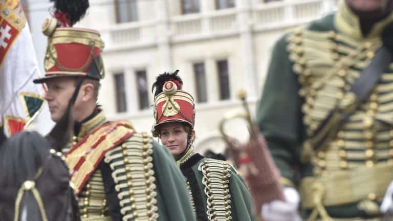 Huszárok az Országház előtt a Kossuth Lajos téren, ahol katonai tiszteletadással felvonták Magyarország lobogóját az 1848-49-es szabadságharc 169. évfordulóján, 2017. március 15-én.