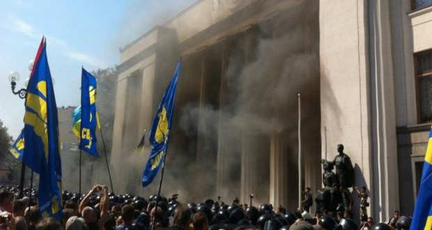 Radikális jobboldali tüntetők megrohamozták az ukrán parlament épületét hétfőn, azt követően, hogy a törvényhozás első olvasatban elfogadta az ukrán alkotmány decentralizációs módosítását, amely nagyobb önrendelkezést biztosít a helyi közösségeknek.