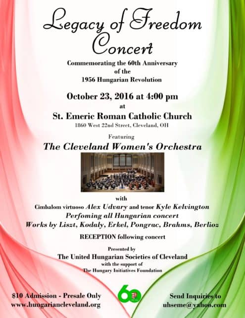 Végül, de nem utolsó sorban a forradalom emléknapjára és arra a hétvégére tervezett eseményekről és a rendezvénysorozat csúcspontjáról is információkat kaphattunk. Október 23-án előbb megemlékező szentmisére és istentiszteletre kerül sor a templomokban, majd a Mindszenty plázánál lesz egy megemlékezés az ‘56-os emlékműnél. Ezt pedig a Cleveland Women’s Orchestra koncertje követi a Szent Imre templomban, amelyre du. 4 órától kerül sor. Minden más rendezvény ingyenes, a koncertre a belépés $10, amelyre jegyeket elővételben többek közt az EME honlapján és a templomoknál lehet vásárolni.
