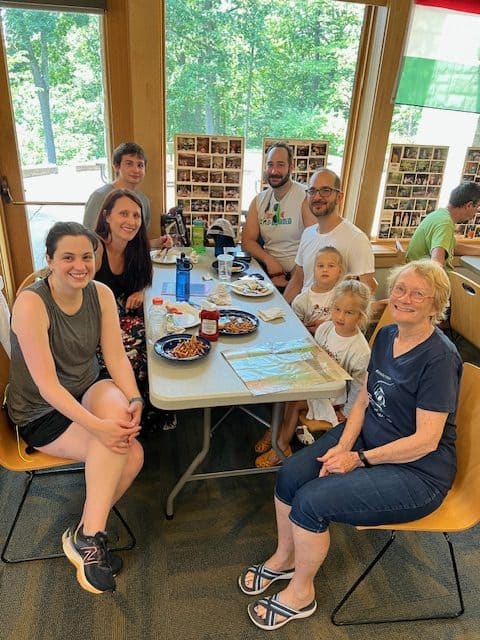 Amikor Andrást megismertem, akkoriban indult el a szétszórtsági létről való közös új gondolkodás és levelezői kör, Csomai Gyurka, Éltető Lajos és András kezdeményezésére. Mihelyst megvolt az esküvőnk, az lett a feladatom, hogy az elküldött írásokat – amelyek néha nem érkeztek meg, ezért időnként el kellett menni értük például Chicagóba – édesapám magyar betűs írógépén legépeltem a stencilre – a stencilgépet azért vásároltuk, hogy tudjunk sokszorosítani –, majd a 25 oldalnyi anyagot havonta elpostáztuk. ‘72-ben volt az első személyes találkozásunk, a pennsylvaniai Herefordban, ahol én voltam a jegyző. Mivel láttuk, mekkora munka egy ilyen találkozót összehozni, a következő évben nem szerveztük meg, csak a vezetőséget hívtuk meg Adába, ahol sokkal többen megjelentek, mint amire számítottunk. Házunk felső szintje még nem volt kiépítve, így sokan hálózsákokban aludtak a garázsban és kocsijaikban. A nagy igényt látva, a következő évben újra megszerveztük a találkozót, két évig a New York állambeli Chautauqua-tónál. Miután ott leégett a központi épület, körülnéztünk, hogy Ohióban milyen állami parkok vannak, amelyek helyt adhatnának egy ilyen rendezvényre, s így találtunk rá a Reménység-tavára. A havi lapokat egészen a ‘90-es évek közepéig szerkesztettük; abban a munkában végig részt vettem, ahogy a találkozások jegyzője is nagyon sokáig én voltam. Emellett 15 éven át szerveztem a gyermekprogramokat. A szülők reggelente leadták a gyerekeket a mi faházunknál, és nálunk, velem voltak mindaddig, amíg a délelőtti előadások befejeződtek. Ha végignézed a képeket, mindig a gyerekek mellett állok, akik minden évben fel is léptek a találkozók végén.