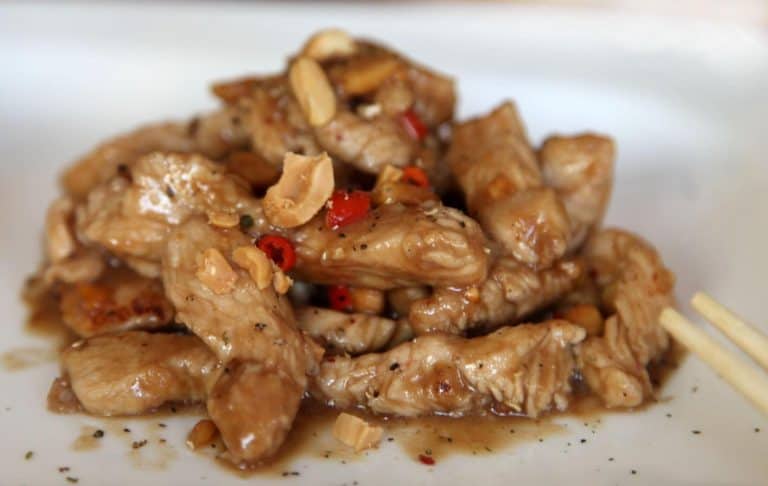 A pulykát vágjuk csíkokra, nyomjuk rá a fokhagymát, szórjuk meg a lereszelt gyömbérrel, és az apróra vágott paprikával. Öntsük rá a vodkát, szórjuk rá a keményítőt, jól keverjük össze és hagyjuk állni pár órát. Egy wok-ba, vagy serpenyőbe öntsünk kókuszolajat, forrósítsuk fel. Dobjuk bele a bepácolt húscsíkokat, nagy lángon pirítsuk kifehéredésig, majd sózzuk meg, tegyük hozzá a szója szószt, folytonosan rázogatva süssük jó puhára. Ekkor adjuk hozza a mézet és a mogyorót, majd ezzel is pirítsuk egy kis ideig.