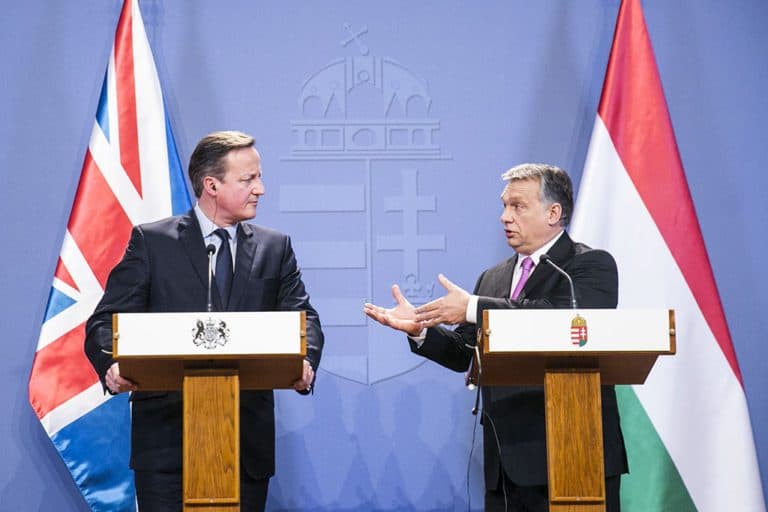 Nagy-Britanniának és Magyarországnak hasonló elképzelései vannak az EU-ról, működő Európát akarnak – mondta David Cameron brit miniszterelnök csütörtökön Budapesten, miután az Országházban tárgyalt magyar kollégájával, Orbán Viktorral. Mindketten erős Európát akarunk – jelentette ki Orbán Viktor kormányfő. A közös sajtótájékoztatón Orbán Viktor szólt a Nagy-Britanniában dolgozó magyarokról, fontosnak nevezve, hogy ne szenvedjenek el semmilyen hátrányos megkülönböztetést a szigetországban. Közölte ugyanakkor, hogy Magyarország minden olyan ésszerű brit javaslatra nyitott, amely megszünteti a visszaéléseket a szociális ellátások területén. ![]()