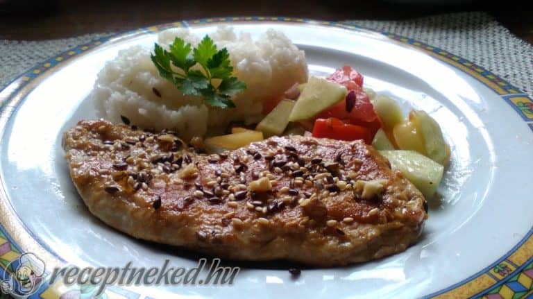 Közben a magvakat egy másik serpenyőbe kis lángon megpirítjuk és a kész csirkemellszeletekre szójuk.