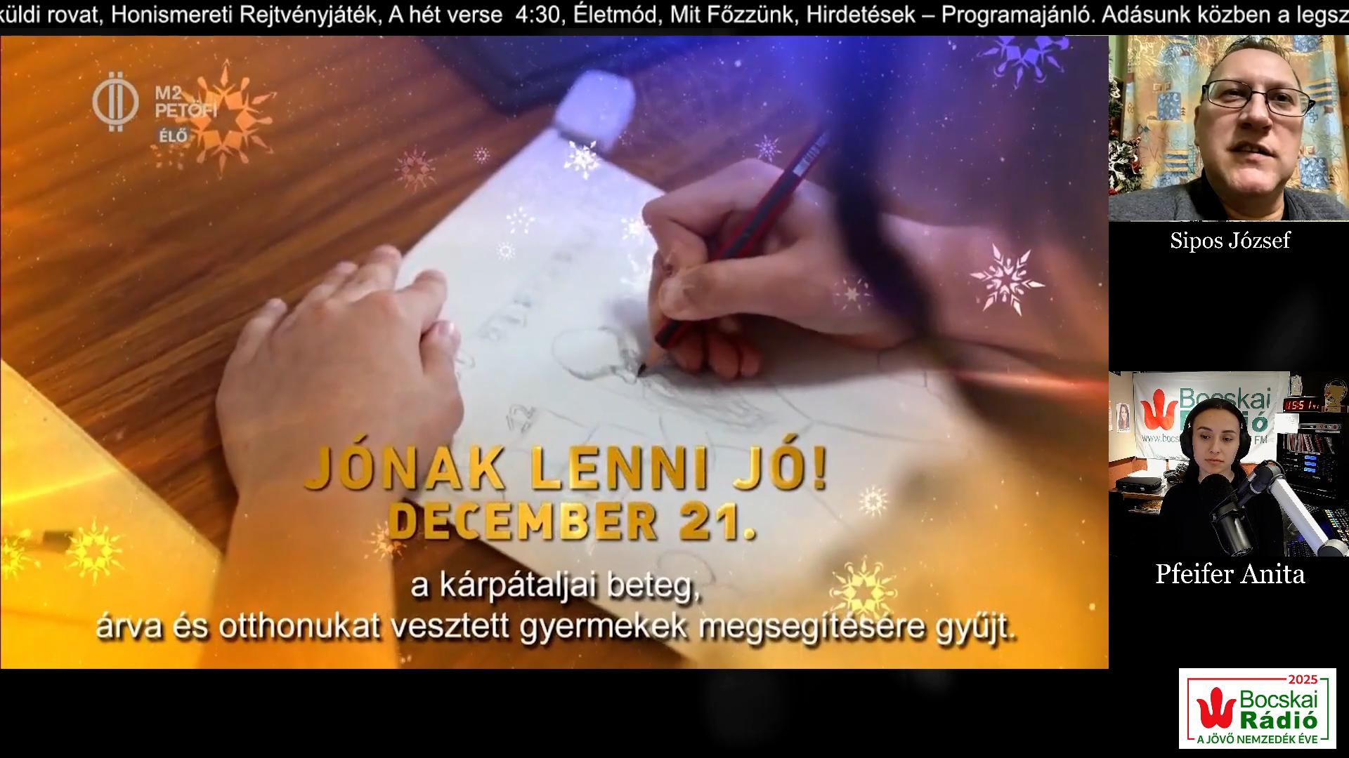A közmédia országos karitatív akciója, a Jónak lenni jó! az elmúlt másfél évtizedben közel hárommilliárd forintnyi adományt juttatott el rászorulókhoz. A kezdeményezés mára a magyar társadalmi felelősségvállalás egyik legerősebb jelképévé vált. 2025-ben a kampány fókuszába a háború sújtotta Kárpátalján élő beteg, árva és kórházban hagyott gyerekek kerültek. A támogatás közvetlen címzettje a kilenc éves múltra visszatekintő KEGYES Alapítvány (Kárpátaljai Elfelejtett Gyermekek Segítése Alapítvány), amely immár kilenc éve gondoskodik azokról a csecsemőkről és kisgyermekekről, akiket szüleik különböző okokból magukra hagynak a kórházban. Az alapítvány elnöke, Sipos József tiszakeresztúri református lelkész – vele beszélgetett Pfeifer Anita a Bocskai Rádió KCSP-ösztöndíjasa.