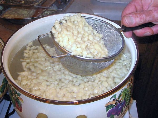 Ezután szaggassuk bele a közben felforrt vízbe. Erre 3 lehetőségünk van… van aki a kör alakú lyukas szaggatót szereti, anyukámnak a téglalap alakú, lapátos, „húzogatós” verzió jött be a legjobban; a harmadik verziót én követem, mert még mindig nincs nokedliszaggatóm – így hát a tál széléről szaggatom bele a forró vízbe egy kanállal.
