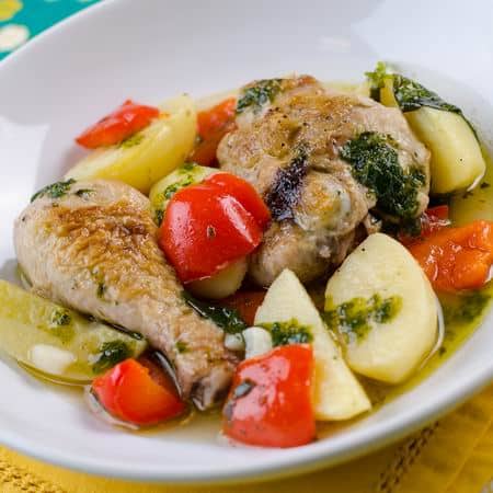 Adjuk hozzá a burgonyákat félbevágva, valamint a paprikát kb. 3 cm-esre felkockázva, valamint az aprított fokhagymát. Pirítsuk össze a zöldségeket a csirkével, majd öntsük fel az alaplével és a fehérborral. Lefedve alacsony lángon kb. 25 percig főzzük.