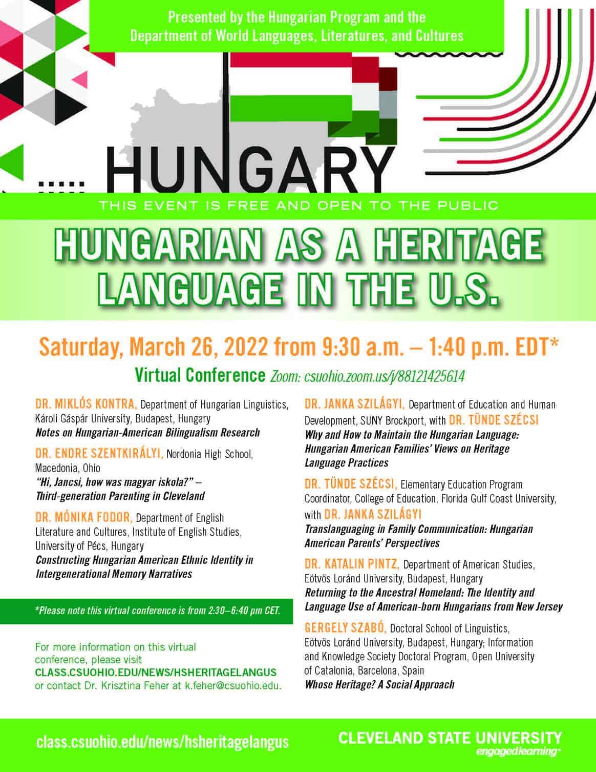 A Cleveland State University nyelvész vendégoktatója és a Department of World Languages, Literatures, and Cultures második alkalommal szerveztudományos konferenciát Clevelandben. Március 26-án lesz az újabb felvonása annak a rendezvénysorozatnak, ami ősszel kezdődött. Akkor a nyelvtanulás szemszögéből közelítették meg a témát, ez alkalommal pedig szociolingvisztikai nézőpontból fogják boncolgatni a magyar nyelv jelenlétét az Egyesült Államokban. A Hungarian as a Heritage Language in United State című konferencia célja, hogy lehetőséget biztosítson a közös szakterületű kutatóknak a diskurzusra, összehozza az anyaország és a diaszpóra elismert szakembereit.