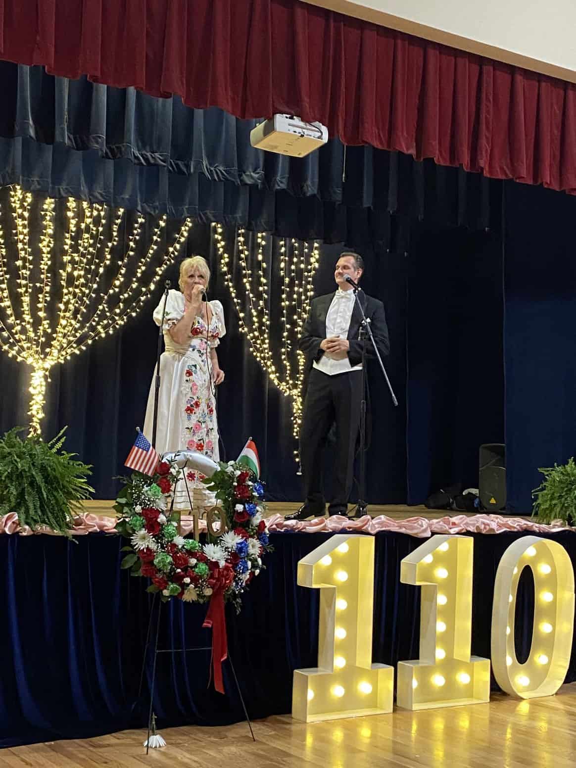 A két helyi néptánccsoport fellépései között lépett színpadra Nagy Ibolya, Déryné-díjas operett-primadonna, színésznő, műsorvezető, tiszteletbeli „Operett Nagykövet”, aki – mint a háziasszony ismertette – minden megjelenésével magas szinten népszerűsíti az operettet, mint hungarikumot. A nemzetközileg ismert InterOperett meghatározó művésze, valamint a Dankó Rádió alapító tagja, ahol a Túl az Óperencián című operett-műsort szerkesztette és vezette. Az ország szinte összes kőszínházában megfordult, és elénekelte a műfaj legszebb primadonna főszerepeit, de megtalálták opera és musical felkérések is. A zenés műfaj az élete, és hirdeti, hogy ezen belül az operett nem más, mint a mosoly muzsikája. A vele fellépő Boncsér Gergely, a Miskolci Nemzeti Színház énekkari tagjaként kezdte pályafutását, majd az Operaház ösztöndíjasa lett, az Oberfrank Géza vezetésével működő stúdió tagjaként. 2009-től az Operettszínház bonvivánja. 2010-ben megnyerte a Lehár Ferenc nevével fémjelzett operett-énekversenyt, a 2016-os évadban Simándy József-emlékplakettet kapott, 2021-ben Magyar Arany Érdemkereszttel tüntették ki, valamint az Operaház Kamaraénekese címet is megkapta. Amint azt Kovács Mózes feleségétől, a szervezésben aktívan részt vevő Zsuzsától megtudtam, Nagy Ibolya régi személyes ismerősük-barátjuk; tíz évvel ezelőtt, azaz a klub 100. születésnapján is fellépett. Bár nem vagyok jártas az operett műfajában, a műsor engem is megragadott, a „Hazám, hazám” pedig az én szívembe is belemarkolt, nemcsak a többi 150, többnyire idősebb generációt képviselő ünneplő közönségébe.