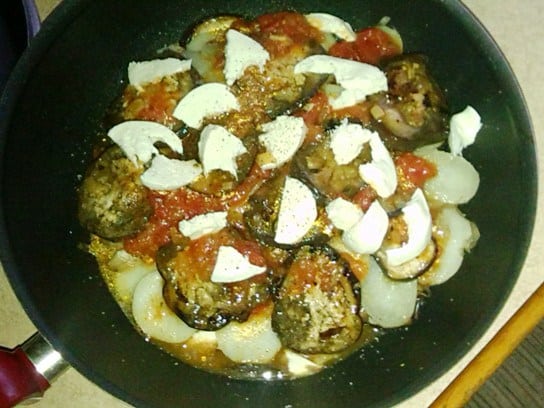 Pici olaj a serpenyőbe, rá a krumpliszeletek, paradicsomszósz, padlizsánkarikák, újabb adag szósz, a sajt fele, aztán újabb burgonyaréteg, és így tovább. amíg minden el nem fogy. Legfelülre sajt kerüljön. Gyújtsuk alá, és süssük készre fedő alatt. Jó étvágyat!