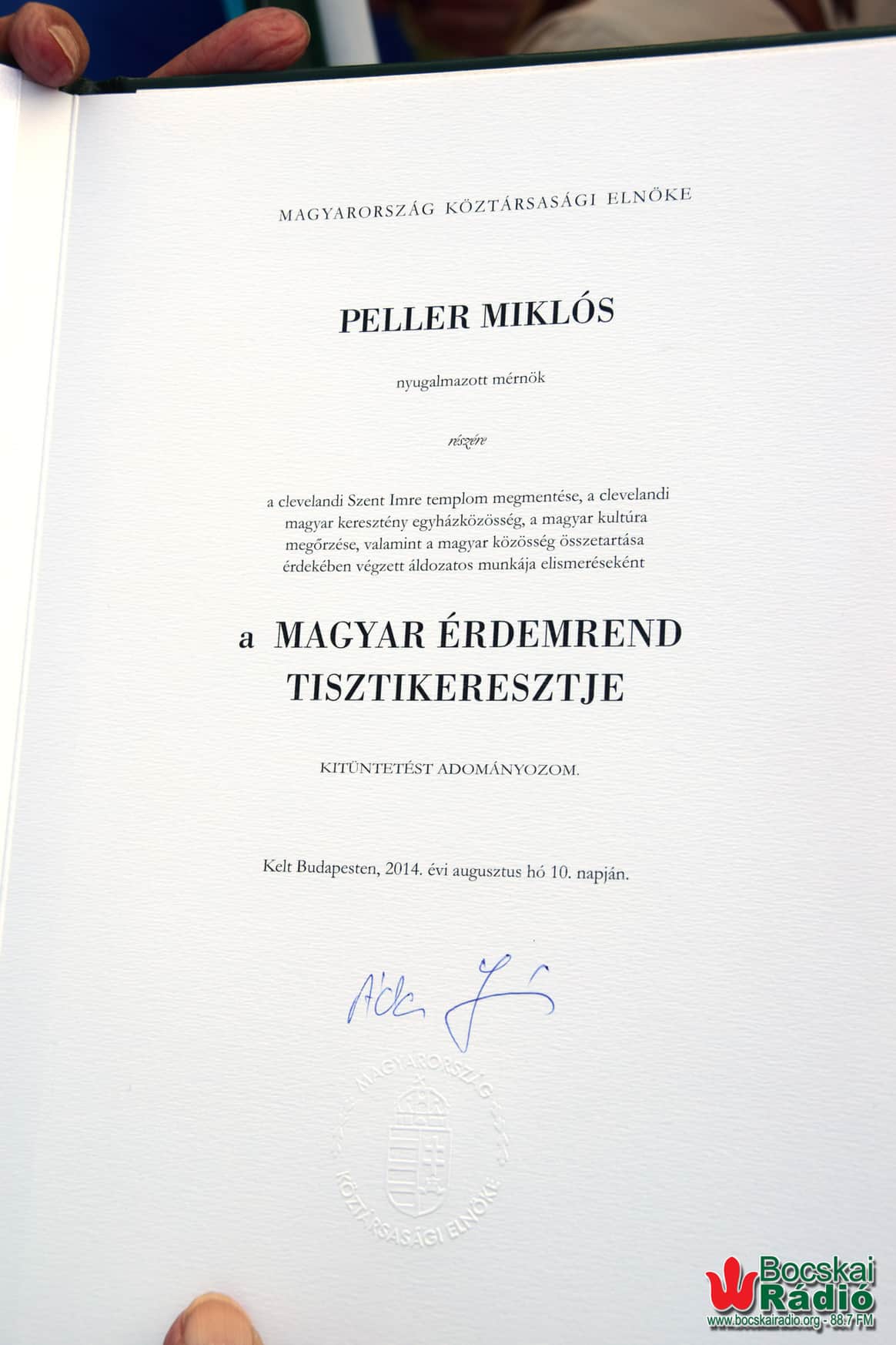 Magyarország Köztársasági Elnöke, Áder János, pedig a MAGYAR ÉRDEMREND TISZTIKERESZTJE KITÜNTETÉSÉT adományozta Peller Miklósnak, 2014. augusztus hó 10. napján. „A clevelandi Szent Imre templom megmentése, a clevelandi magyar keresztény egyházközösség, a magyar kultúra megőrzése, valamint a magyar közösség összetartása érdekében végzett áldozatos munkája elismeréseként.”