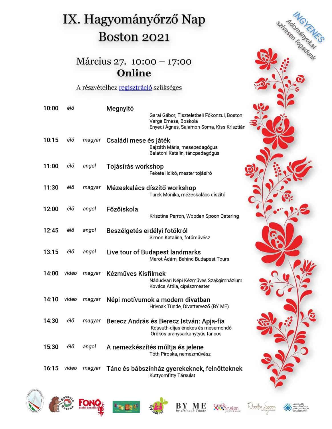 A programsorozatot hivatalosan Dr. Garai Gábor, bostoni tiszteletbeli főkonzul nyitotta meg. Az első programot “Családi mese és játék” címmel Bajzáth Mária mesepedagógus és Balatoni Katalin néptáncpedagógus két magyarországi helyszínről bejelentkezve felváltva vezette. Mindketten visszajáró előadói a bostoni hétvégi iskola, a Boskola, közösségének.