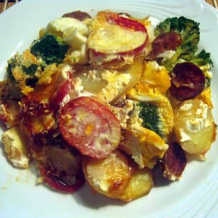Tűzálló tálat a kolbász zsírjával kikenjük, majd a vékonyan szeletelt krumplival elkezdjük építeni/rétezni a rakottát: