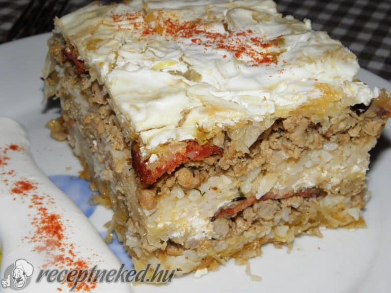 - Mély tűzálló edényt vagy lábast zsírral kikenünk, az aljára tesszük a káposzta egyharmadát, erre a szalonna és a kolbász egyharmadát, egy réteget a rizses darálthúsból, majd meglocsoljuk tejföllel. Ezután ugyanilyen sorrendben ismételjük a lerakást, végül befedjük a megmaradt káposztával. Megöntözzük a maradék tejföllel, meghintjük pirospaprikával, még egy kis olvasztott zsírral meglocsoljuk, öntsünk hozzá 1 csésze vizet és sütőben körübelül 1.5-2 óra hosszat süllögtetjük 365F-on.