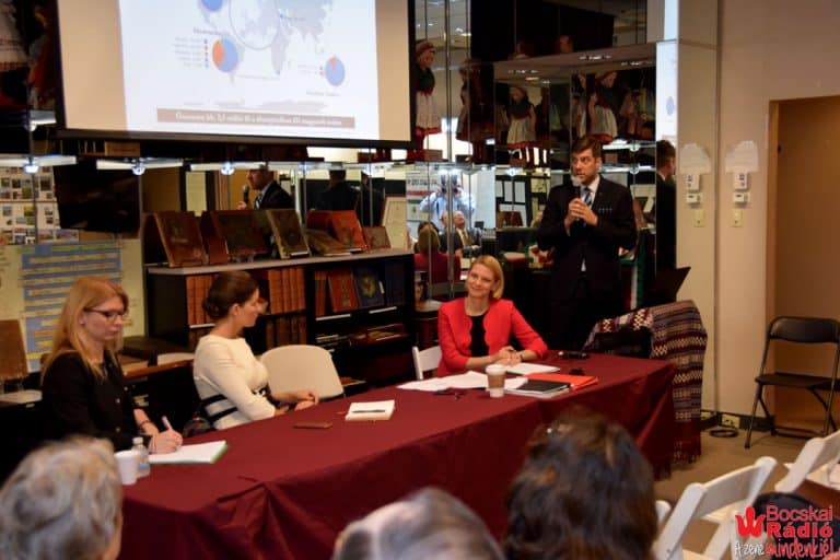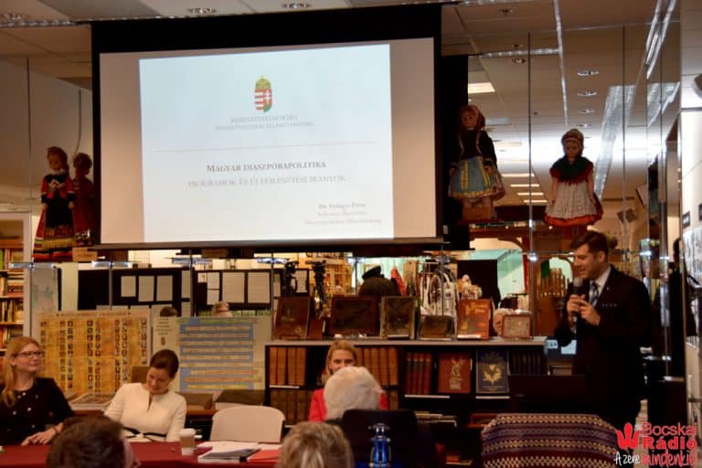 „A nemzetpolitika a hálószobában kezdődik.”- idézte Dr. Szilágyi Péter a nemzetpolitika alappillérének számító mondását. Helyettes Államtitkár Úr elmondta, hogy 1920 óta, ilyen erősen a nemzetpolitikával nem foglalkoztak. A magyarság világnemzetté vált, csak Észak-Amerikában majdnem 2 millió magyar fő él, továbbá nagy számban élnek magyarok Ausztráliában és Nyugat-Európában is. 2016-ban 73,5 milliárd forintot fordított a kormány a nemzetpolitikára. 2016-2017-ben többek között Amerikában támogatták az Arany János iskolát New Yorkban, a méltán híres Itt-Ott tábort, a washingtoni Magyar Házat és a Nebuló Magyar Nyelviskolát Clevelandben. Az előadás során Helyettes Államtitkár Úr ismertette a Nemzetpolitikai Államtitkárság legfontosabb jelenleg is aktív programjait; a Kőrösi Csoma Sándor programot, a Mikes Kelemen programot és a Rákóczi Szövetség programját.
