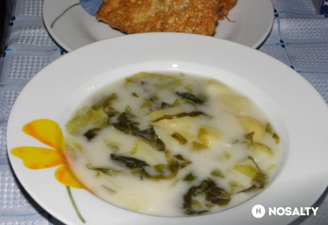 A salátát folyó vízzel jól kimossuk, és felaprítjuk. Ha a krumpli megpuhult, hozzáadjuk, ízesítjük cukorral, ecettel. Addig főzzük, míg a saláta megfonnyad