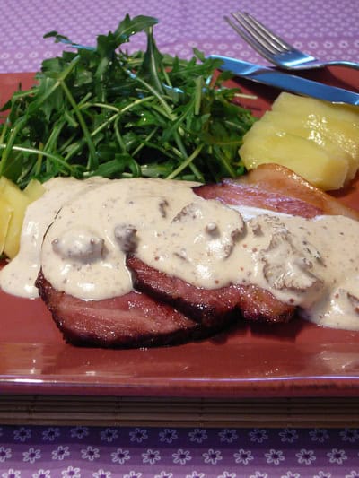 Elkészítése egyszerű és gyors is. Hevítsük fel az olíva olajat. Tegyük bele a sonkaszeleteket, és süssük pirosra mindkét oldalukat. Ha megsültek a sonkák, tegyük őket tányérra, fedjük le és tartsuk melegen. A megmaradt sütőzsiradékba öntsük bele először a bort. Forraljuk fel. Miután kiforrt, adjuk hozzá a a magos dijonii mustárt, a főzőtejszínt és sűrítsük mártássá.