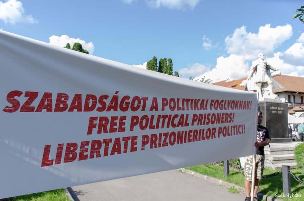 Több százan gyűltek össze csütörtök délután Kézdivásárhely főterén, hogy a terrorizmus miatt elítélt Beke István és Szőcs Zoltán bebörtönzése ellen tiltakozzanak. A Hatvannégy Vármegye Ifjúsági Mozgalom két aktivistája mellett kiállók székely és magyar zászlókkal vonultak utcára, a tüntetők háromnyelvű (magyarul, románul és angolul is olvasható), Szabadságot a politikai foglyoknak! feliratot tartottak a magasba.