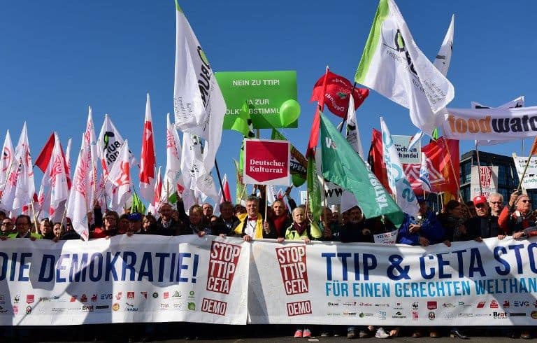 A TTIP ellenzői főleg azzal érvelnek, hogy ez a szerződés túlságosan nagy hatalmat biztosít majd a multinacionális cégeknek a fogyasztók és az alkalmazottak rovására. A tüntetés szónokai is hangoztatták ezt a szempontot, kifejtve, hogy ez a szerződés gyengítheti az európai normákat, ronthatja az ökológiai és szociális szabványokat. A menetben olyan feliratokat tartottak a magasba, amelyek a szociális állam, a környezet védelme és a demokrácia mellett foglaltak állást. “A TTIP rabszolgákká változtat minket” – volt olvasható az egyik transzparensen.