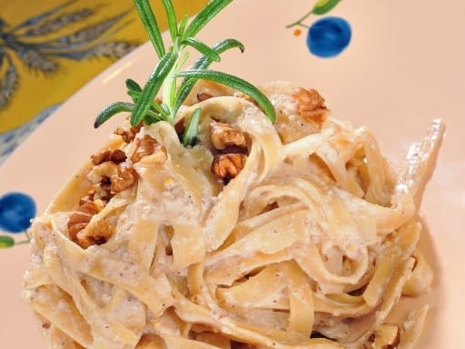 1. A zsemlemorzsát, a diót, a fokhagymát, a tejet, az olívaolajat és a krémsajtot egy nagy tálban vagy konyhai robotgépben jól összedolgozzuk, majd hozzákeverjük a tejszínt. Az így kapott sűrű mártást sóval, borssal ízesítjük.