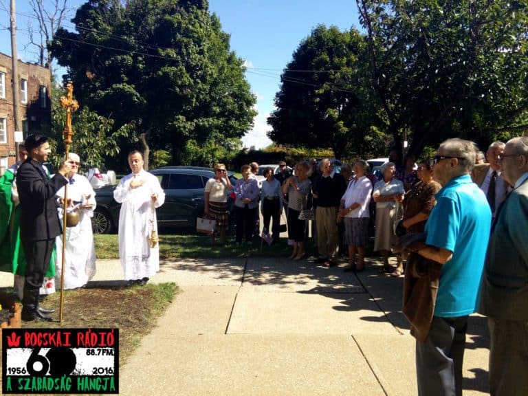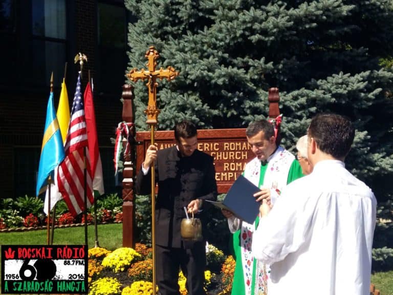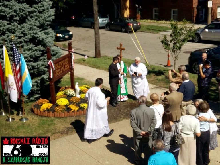 A gondolatokat tettek követték és így a szeptember 11-i vasárnapi 11 órás szentmisét követően ünnepélyes keretek között felszentelte András atya a névtáblát és a mellette álló nemzeti zászlókat is megszentelte, melyek közt a magyar és amerikai zászló mellett ott díszeleg a pápai- és a székely zászló is. A szentelés után előbb a pápai himnusz csendült fel, majd a magyar, a székely és az amerikai himnuszt is együtt énekelte a mintegy 180 érdeklődőből álló ünneplő sereg.