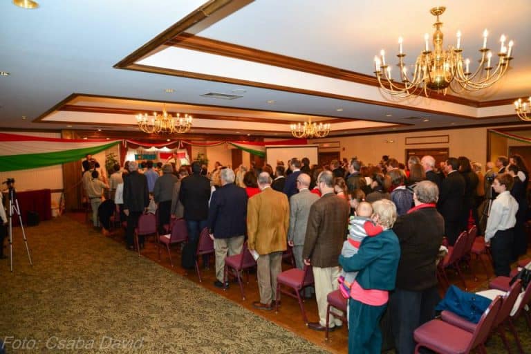 A helyszín már egymagában nagyon impozáns volt, de a szervezők külön kitettek magukért a terem ünneplőbe öltöztetésével, piros, fehér, zöld színekben pompázott minden. Az emberek egyre csak gyűltek, mellükre simuló kokárdákkal. Gyermekek kacajától volt hangos az előtér.