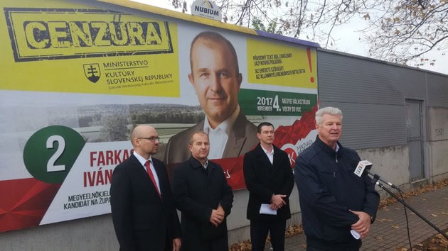 Egy héttel a megyei választások előtt a nyelvtörvényre hivatkozva leragasztatta a szlovák kulturális minisztérium a Magyar Közösség Pártjának (MKP) több választási óriásplakátját – jelentették be pénteken, Párkányban (Stúrovo) tartott sajtótájékoztatójukon a felvidéki magyar párt politikusai.
