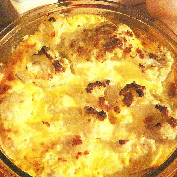 A húsból a zöldpaprikával meg a paradicsommal pörköltet készítünk. Megfőzzük a karfiolt sós vízben, lecsurgatjuk a levét, és rózsáira szedjük. Kikenünk egy mély tűzálló tálat pörköltlével, aljára terítjük a karfiol felét, erre vágjuk karikára a kemény tojásokat, és befedjük a pörkölthússal. Tetejére rakjuk a maradék karfiolt, és enyhén sózzuk, borsozzuk, majd leöntjük tejföllel, megszórjuk reszelt sajttal és forró sütőben megsütjük.