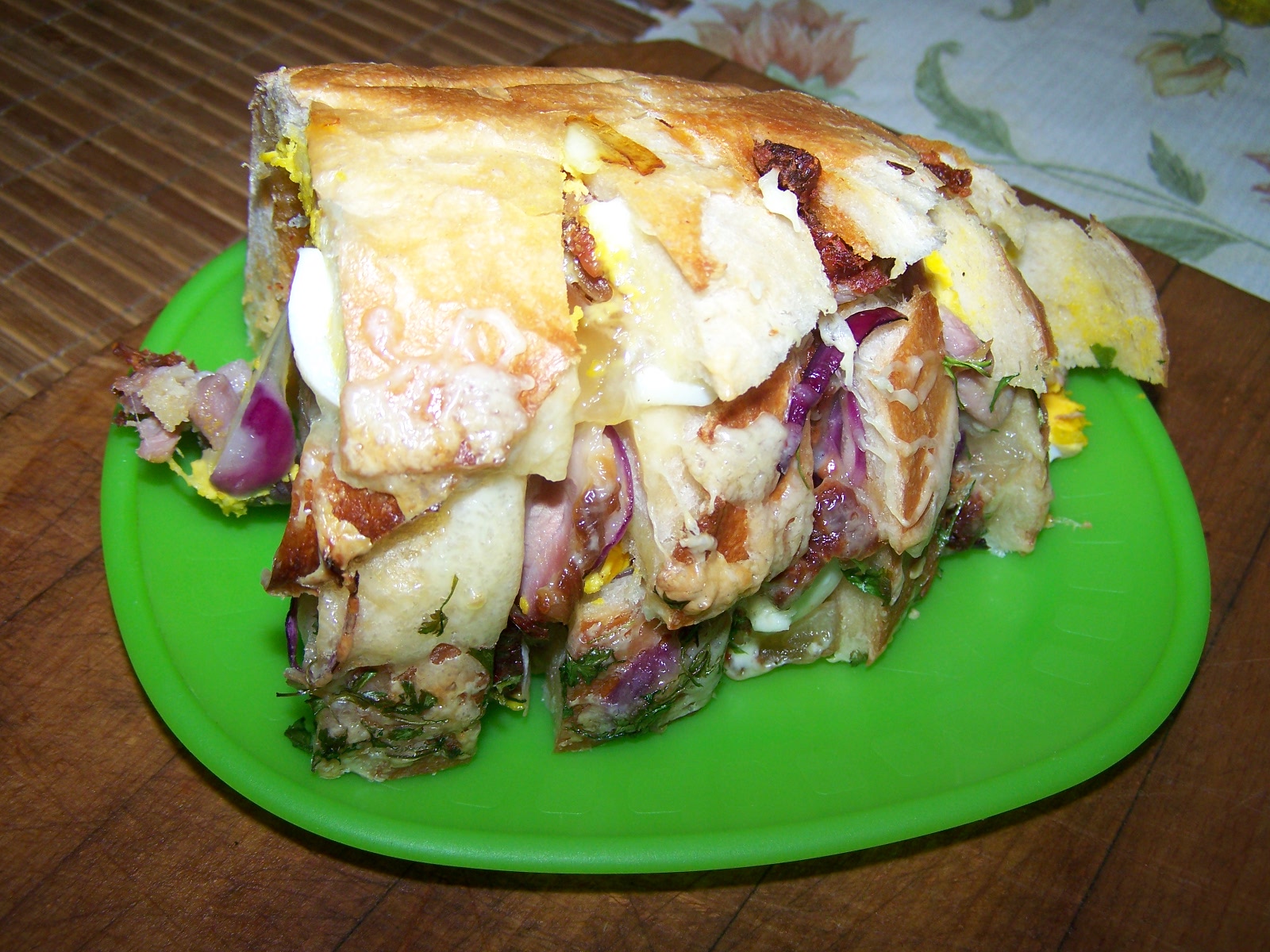 Az eredeti képen nekem úgy tűnt, hogy csak sajtokkal van telerakva a kenyér, de az ünnepekre való tekintettel (meg amúgy is) minden finomság volt itthon, úgy gondoltam mindenfélével megtömöm a kenyeret.