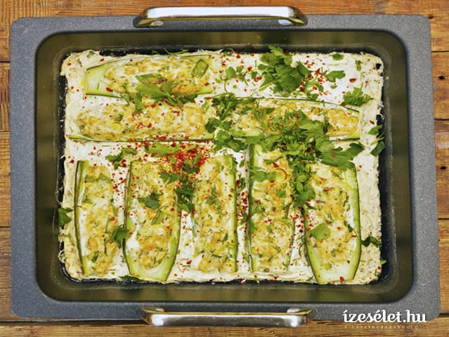 A mártást egy magas falú tepsi aljába öntjük, és beleültetjük a félbe vágott, megtöltött uborkákat. 25 percre 190 C fokra előmelegített sütőbe tesszük, és zöldborsós újkrumplival tálaljuk.