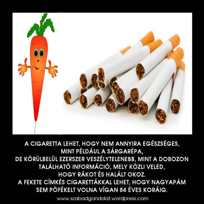 Kedves olvasó, ha nem cigarettázol, mert nélküle is jól vagy, emelem kalapom előtted. Ha meg cigarettázol, ne felejts el gondolatban címkét cserélni a dobozon, örülni neki, és hálát adni érte, hogy használhatod. Ja és még egy dolgot nem szabad elfelejtened: megbocsátani a címkézőknek, és szeretettel gondolni rájuk. Nagy szükségük van rá, ugyanis annyira elvakította a „jó szándék” szemeiket, hogy nem tudják, mit cselekednek, nem veszik észre, hogy fekete mágiára pazarolják életük idejét.