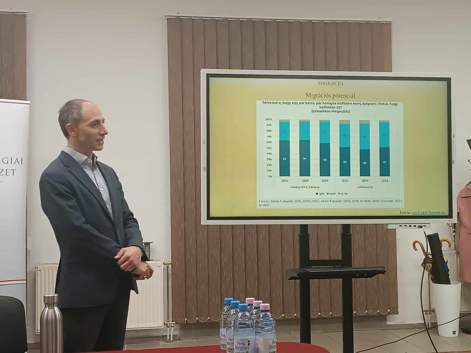 Dr. Gazsó Dániel, a NKE oktatója, tudományos főmunkatársa és a NPKI diaszpórakutatásért felelős kutatási referensének „Jelenkori magyar emigráció” című előadásának célja a jelenkori magyar társadalmat érintő migrációs folyamatok bemutatása, különös tekintettel az elvándorlást kiváltó tényezőkre. Mint hangsúlyozta, az elvándorlás mutatói szélsőséges értékeket és radikális változásokat jeleztek az elmúlt bő évtizedben. Az előadó ismertette, hogy a „fiatalok exodusának” is nevezett kivándorlási hullám következtében a külföldre költözött magyar állampolgárok száma a nyugat-európai országok tükör-statisztikái szerint a 2010-es évek közepére meghaladta az évi 85 ezer főt, miközben ugyanezen időszakban a hazai statisztika szerint a Magyarországról kivándorló magyar állampolgárok száma évi 20-35 ezer között ingadozott. Az elvándorlás üteme ezt követően mérséklődött, majd a Covid-járvány után ismét fellendült. Tájékoztatása szerint az EGT-országok és Egyesült Királyságban élő magyar állampolgárok száma 2014-ben 89.713 fő, 2023-ban 545.698 fő volt; 2023-ban az öt legnagyobb célországot: Németország (35,5%), Egyesült Királyság (21.6%), Ausztria (18,3%), Svájc (5,1%) és Hollandia (3,8%) jelentette.