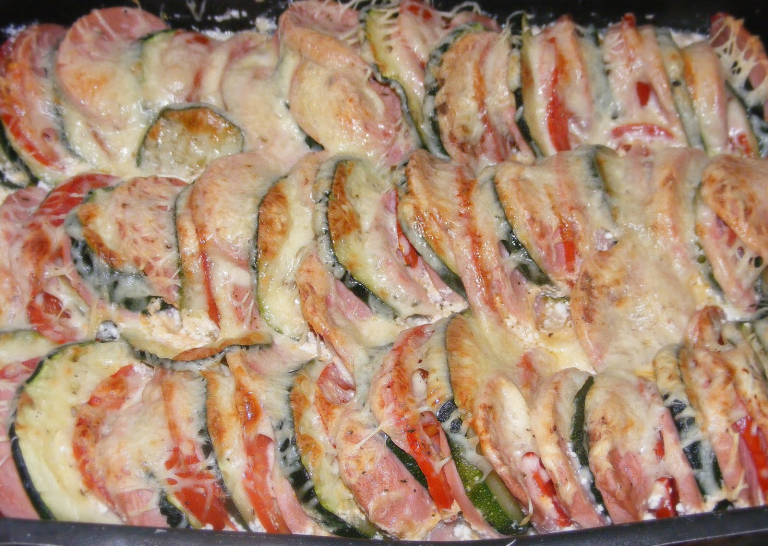 A sonkaszalámi bőrét lehúzzuk, és szeletekre vágjuk. Ugyanúgy a paradicsomokat és a cukkiniket is. Egy magas tepsit kivajazunk, majd váltakozva, hogy félig takarják egymást belerakjuk a sonka és zöldségkarikákat.