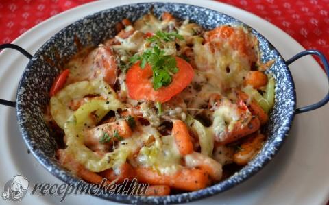 Reszelt sajttal megszórjuk, és a forró sütőben készre sütjük, vigyázva arra, hogy ne égjen meg a sajt.